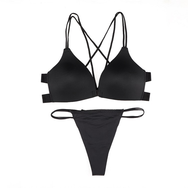 - Two-piece bra and panty set with strappy hollow design for bold styling.